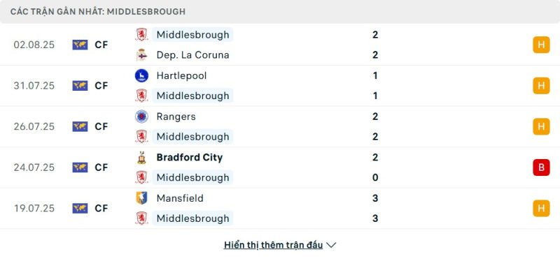 Middlesbrough bước vào mùa giải 2025/26 với chuỗi trận giao hữu tương đối tệ. Họ hòa Deportivo La Coruna 2-2, Hartlepool 1-1 và Mansfield 3-3, đồng thời hòa Rangers 2-2. Dù kết quả bất bại là tín hiệu tích cực, việc để thủng lưới khá nhiều bàn cho thấy hàng thủ của Middlesbrough vẫn chưa đạt sự chắc chắn tối đa. Kết thúc mùa trước ở Championship, họ từng giành chiến thắng quan trọng trước Swansea và nhiều đối thủ khác, cho thấy khả năng thi đấu tốt khi gặp những đội bóng quen thuộc.