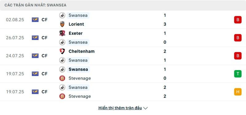 5 trận gần nhất của Swansea City: L-L-L-W-D