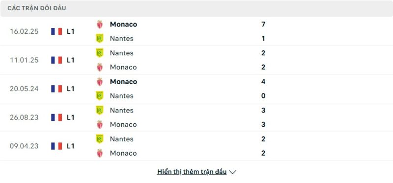Thành tích đối đầu của Nantes vs Monaco