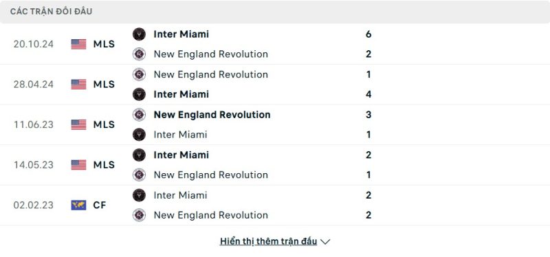 Thành tích đối đầu của New England Revolution vs Inter Miami CF