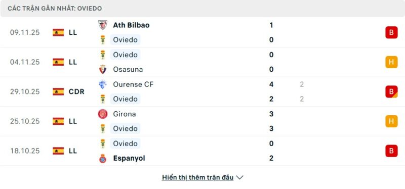 5 trận gần nhất của Oviedo: L-D-D-D-L