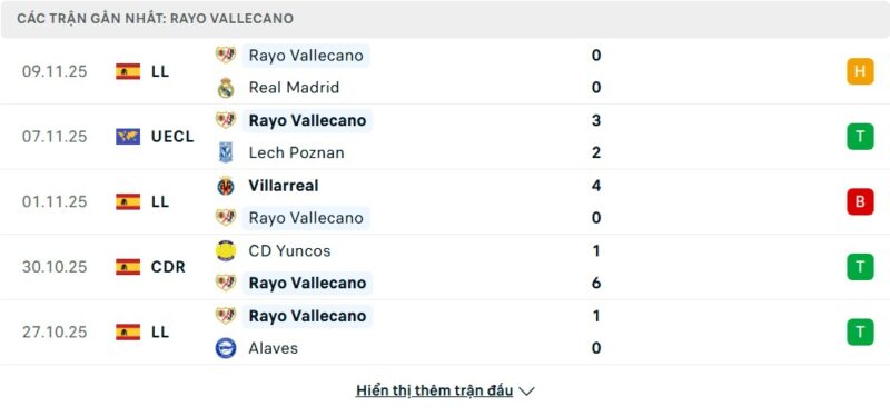Phong độ của Rayo Vallecano