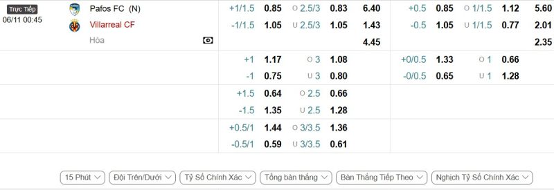 Bảng Tỷ lệ kèo bóng đá Pafos vs Villarreal