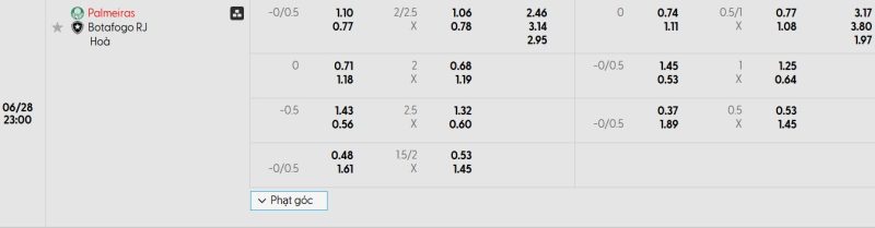 Bảng Tỷ lệ kèo bóng đá Palmeiras vs Botafogo