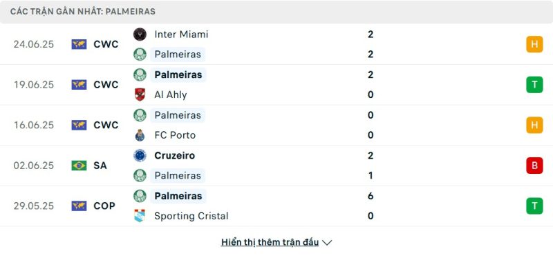 5 trận gần nhất của Palmeiras: D-W-D-L-W