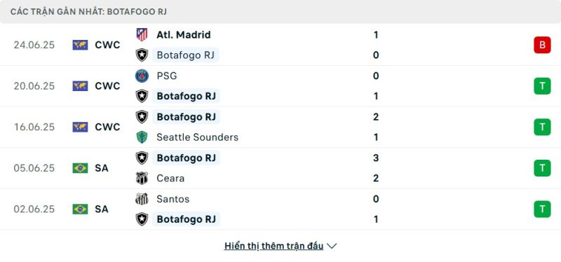 5 trận gần nhất của Botafogo: L-W-W-W-W