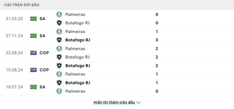 Thành tích đối đầu của Palmeiras vs Botafogo