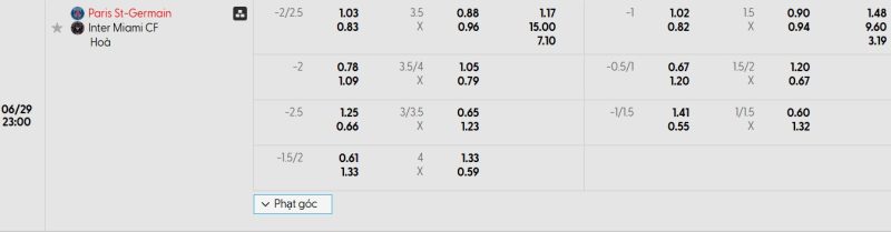 Bảng Tỷ lệ kèo bóng đá Paris Saint-Germain vs Inter Miami CF