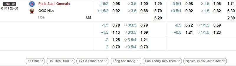 Bảng Tỷ lệ kèo bóng đá Paris Saint-Germain vs Nice