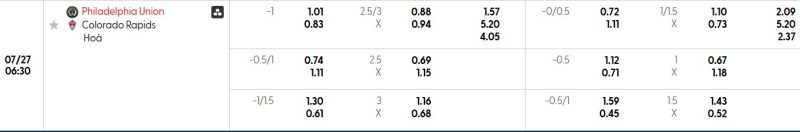 Bảng Tỷ lệ kèo bóng đá Philadelphia Union vs Colorado Rapids
