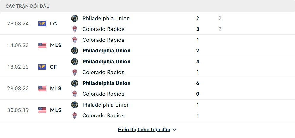 Thành tích đối đầu của Philadelphia Union vs Colorado Rapids