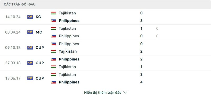 Thống kê phong độ gần đây Philippines vs Tajikistan