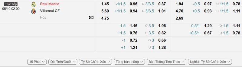 • Kèo tỷ số bóng đá hiệp 1: Real Madrid 2-0 Villarreal