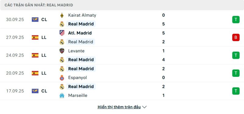 5 trận gần nhất của Real Madrid: W-L-W-W-W