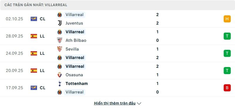 5 trận gần nhất của Villarreal: D-W-W-W-L