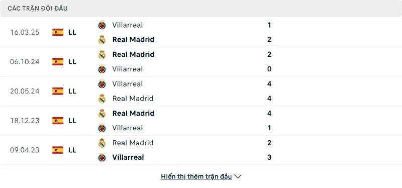 Thành tích đối đầu của Real Madrid vs Villarreal