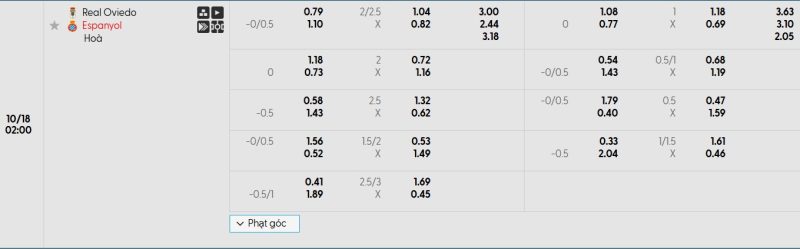 Bảng Tỷ lệ kèo bóng đá Real Oviedo vs Espanyol