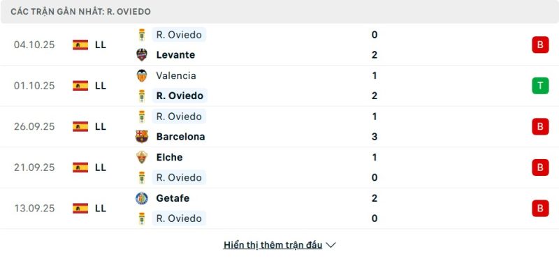 5 trận gần nhất của Real Oviedo: L-W-L-L-L