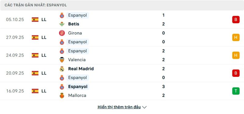 5 trận gần nhất của Espanyol: L-D-D-L-W