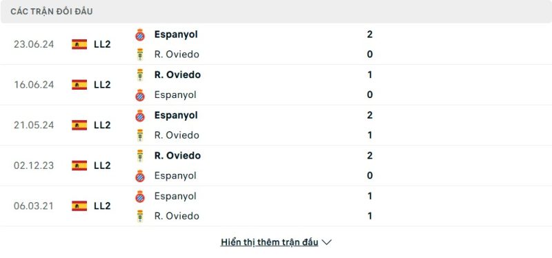 Thành tích đối đầu của Real Oviedo vs Espanyol