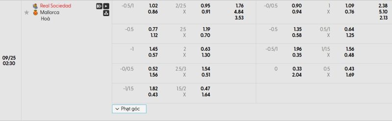 Bảng Tỷ lệ kèo bóng đá Real Sociedad vs Mallorca