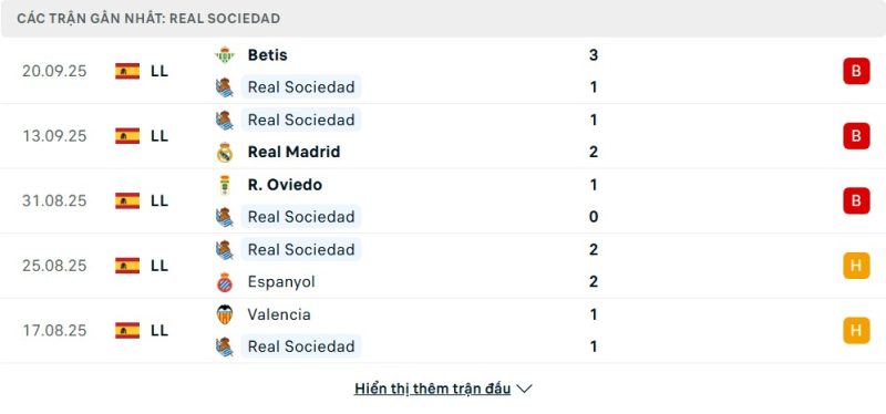 5 trận gần nhất của Real Sociedad: L-L-L-D-D