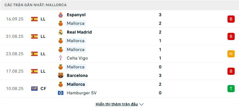5 trận gần nhất của Mallorca: L-L-D-L-W