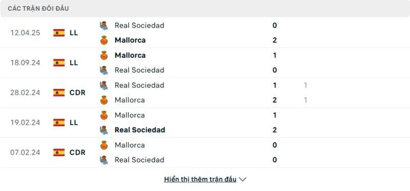 Thành tích đối đầu của Real Sociedad vs Mallorca
