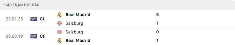 Thành tích đối đầu của Red Bull Salzburg vs Real Madrid