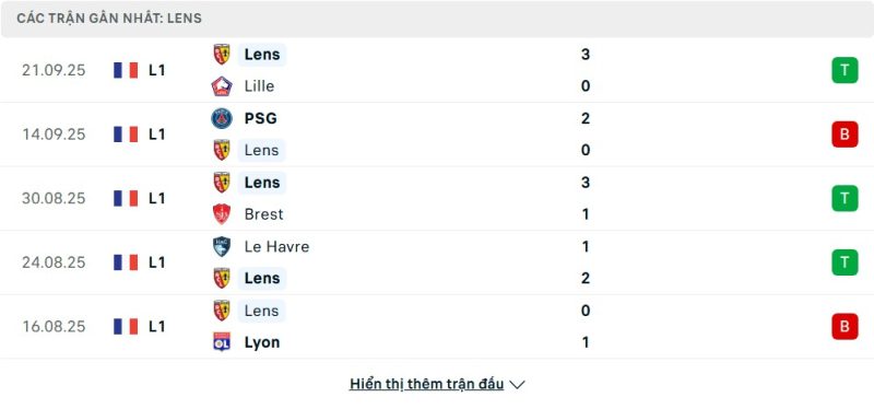 Lens có màn trình diễn khá tốt khi mang về 9 điểm sau 5 trận, qua đó đứng trong nhóm cạnh tranh tốp đầu. Họ gây ấn tượng bằng chiến thắng 3-0 trước Lille và vượt qua Brest với tỷ số cách biệt, cho thấy sức mạnh tấn công đáng gờm. Dù để thua PSG và Lyon, đội bóng này vẫn chứng minh sự lì lợm khi đánh bại Le Havre ngay trên sân khách. Với hàng công hiệu quả cùng hàng thủ kỷ luật, Lens đang được xem là đối thủ khó chịu cho bất kỳ đội bóng nào tại Ligue 1. Tinh thần hưng phấn sau những chiến thắng giúp họ có thêm sự tự tin.