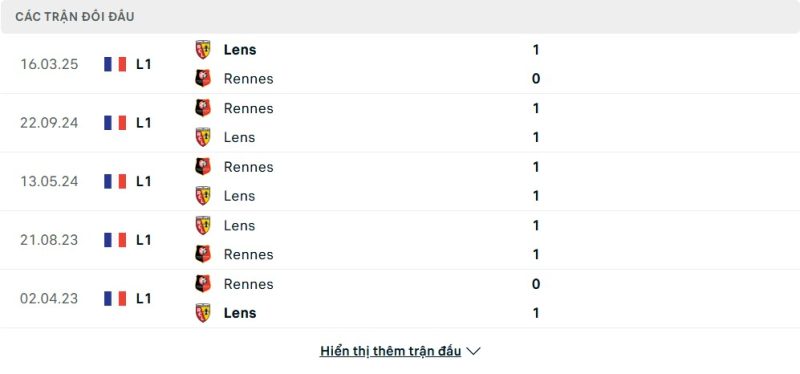 Thành tích đối đầu của Rennes vs Lens