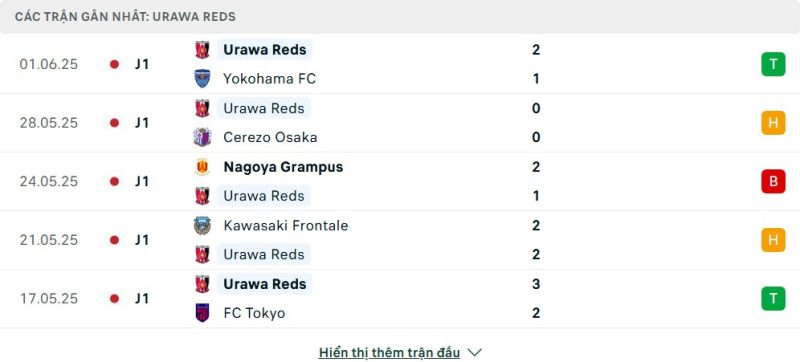 5 trận gần nhất của Urawa Red Diamonds: W-D-L-D-W