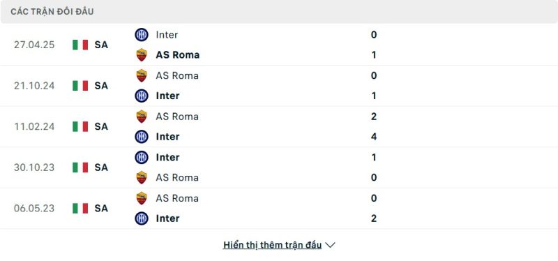 Thống kê phong độ gần đây Roma vs Inter Milan