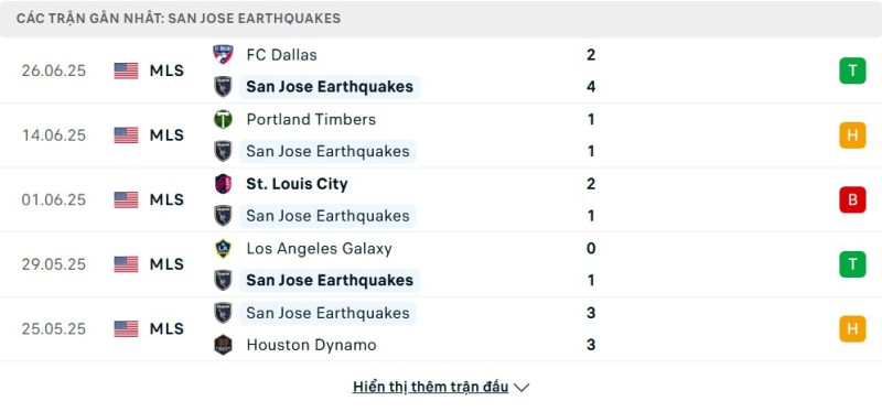 5 trận gần nhất của San Jose Earthquakes: W-D-L-W-D