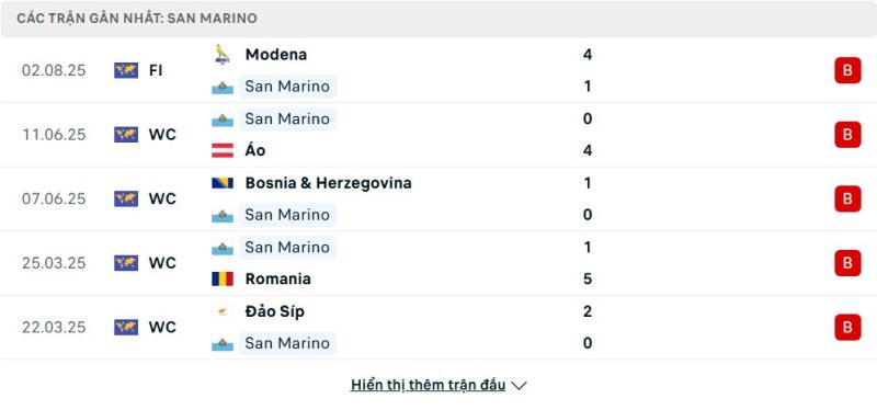 5 trận gần nhất của San Marino: L-L-L-L-L