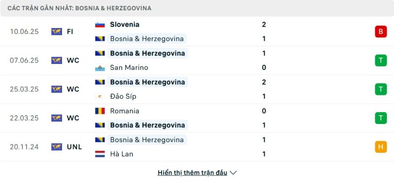 5 trận gần nhất của Bosnia & Herzegovina: L-W-W-W-D