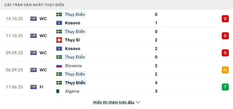 5 trận gần nhất của Thụy Điển: L-L-L-D-W