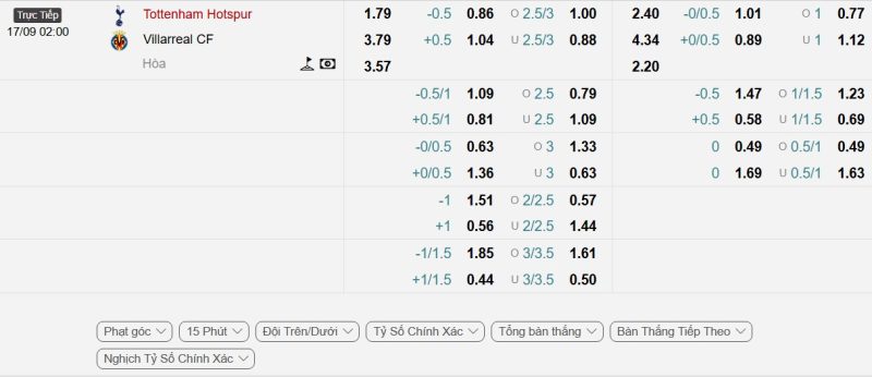 Bảng Tỷ lệ kèo bóng đá Tottenham Hotspur vs Villarreal