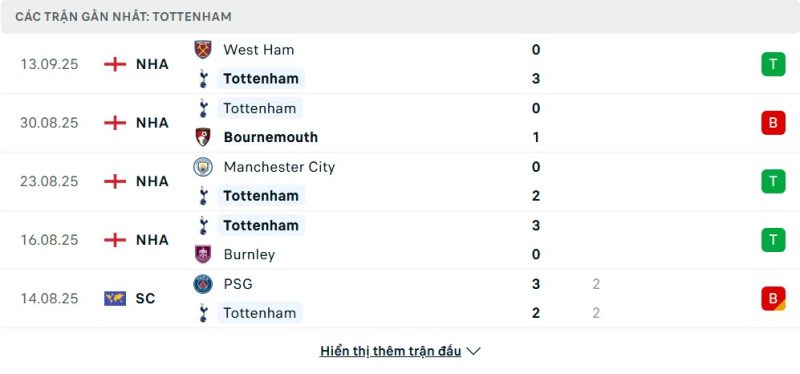 5 trận gần nhất của Tottenham Hotspur: W-L-W-W-D