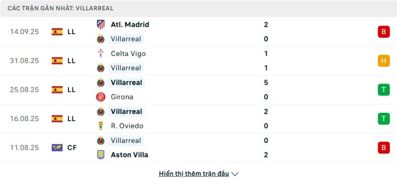 5 trận gần nhất của Villarreal: L-D-W-W-L