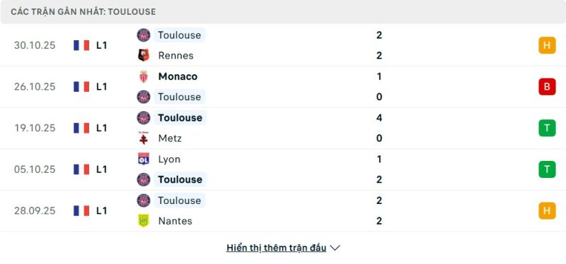 Toulouse đang đứng ở vị trí thứ 9 trên bảng xếp hạng Ligue 1 với 14 điểm sau 10 vòng đấu. Phong độ của họ gần đây có dấu hiệu chững lại khi không thắng trong hai trận gần nhất, bao gồm trận hòa 2-2 với Rennes và thất bại 0-1 trước AS Monaco. Trước đó, đội chủ sân Stadium de Toulouse đã có chuỗi trận ấn tượng khi đánh bại Metz 4-0 và Lyon 2-1. Nhìn chung, thành tích của Toulouse khá thất thường, họ có 4 trận thắng, 2 trận hòa và 4 trận thua. Trận đấu này là cơ hội để họ tìm lại cảm giác chiến thắng.