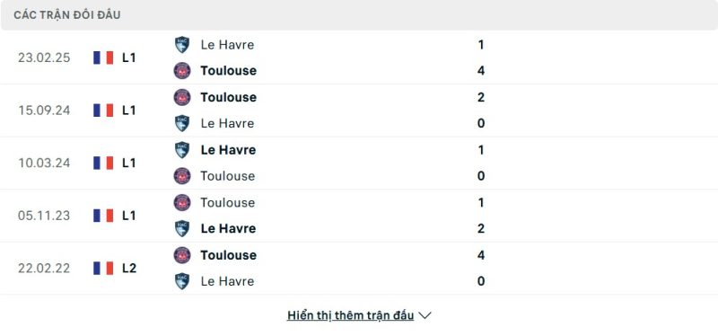Thành tích đối đầu của Toulouse vs Le Havre