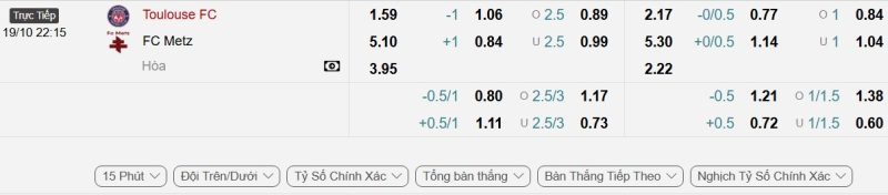 Bảng Tỷ lệ kèo bóng đá Toulouse vs Metz