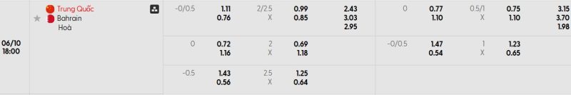 Bảng Tỷ lệ kèo bóng đá Trung Quốc vs Bahrain