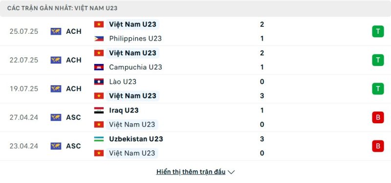 5 trận gần nhất của U23 Việt Nam: W-W-W-L-L