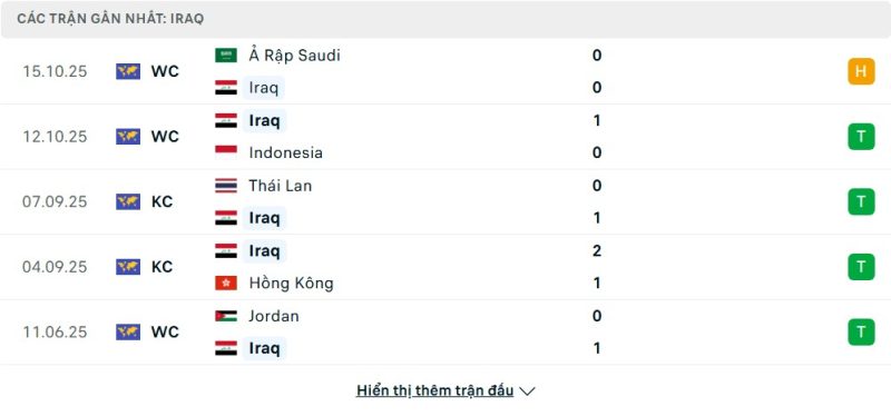 5 trận gần nhất của Iraq: D-W-W-W-W