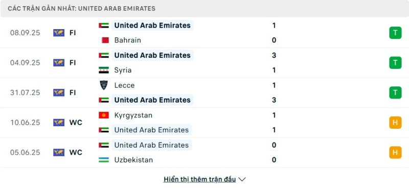 5 trận gần nhất của UAE: W-W-W-D-D