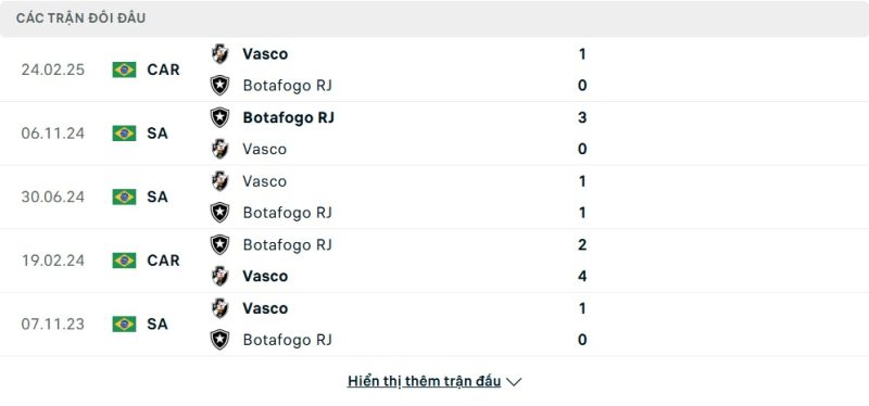 Thành tích đối đầu của Vasco da Gama vs Botafogo