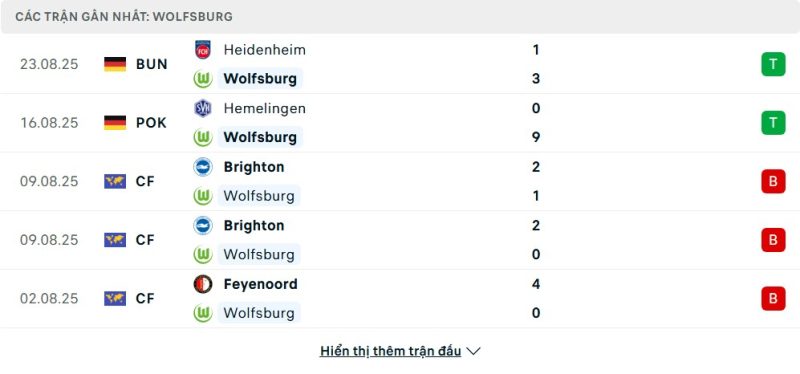 VfL Wolfsburg đang có một phong độ ấn tượng. Sau chiến thắng 3-1 trước Heidenheim ở vòng đấu đầu tiên, “Bầy Sói” đã leo lên vị trí thứ 5 trên bảng xếp hạng. Sức mạnh tấn công của họ thể hiện rõ qua trận thắng hủy diệt 9-0 trước SV Hemelingen tại DFB Pokal. Mặc dù có một vài trận thua đáng tiếc trong các trận giao hữu trước đó, nhưng khi bước vào các giải đấu chính thức, Wolfsburg luôn cho thấy sự quyết tâm và hiệu quả. Vị trí hiện tại trên bảng xếp hạng là minh chứng rõ nhất cho sự ổn định của đội bóng này.