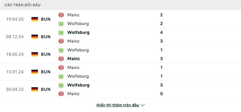 Thành tích đối đầu của VfL Wolfsburg vs Mainz 05